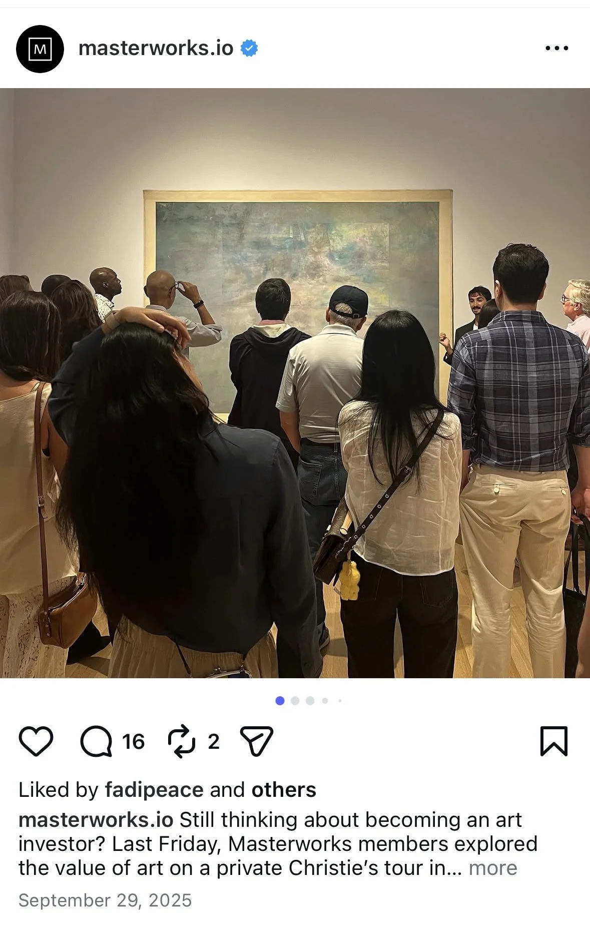 They are not looking for a Barron’s-style brand. They want to invest alongside people who share their taste. They follow artists on Instagram. They go to gallery shows not because they have to, but because they want to. Art is already part of their identity — Masterworks just hasn’t shown up in their world yet.